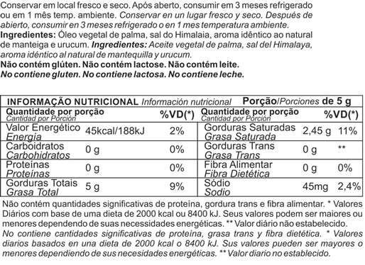Ingredientes: Aceite vegetal de palma, sal del Himalaya, aroma idéntico al natural de mantequilla y urucum.